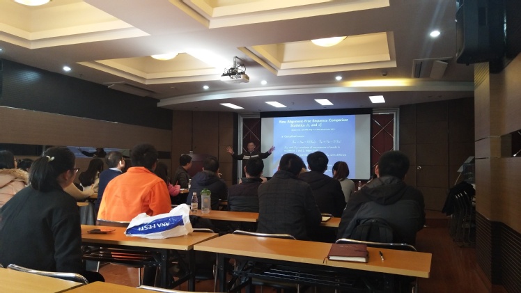 报告中,孙教授从非序列比对的基本原理讲起,深入浅出的为大家讲解了从序列比对到非序列比对的研究趋势,以及新的非序列比对方法,包括用于基因组和宏基因组比较的d2*和d2s,除此之外孙教授还从宏基因组学的角度为大家详细展示了有关宏基因组中的病毒和病毒-宿主相互作用的研究,教授还跟现场师生精彩互动,整场报告令师生们收获颇丰。