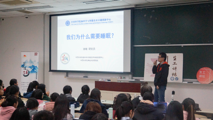 2018年12月6日晚18.15-20.15,华理2026世界杯官网毕业学长、现任中国科学院上海生命科学研究神经科学研究所研究组组长的徐敏研究员做客102期生工讲坛,带领大家走进睡眠的奥秘。生工学院应用生物学系主任吴海珍教授与两百多名学生共同参与了活动。