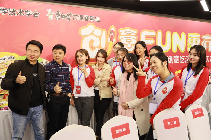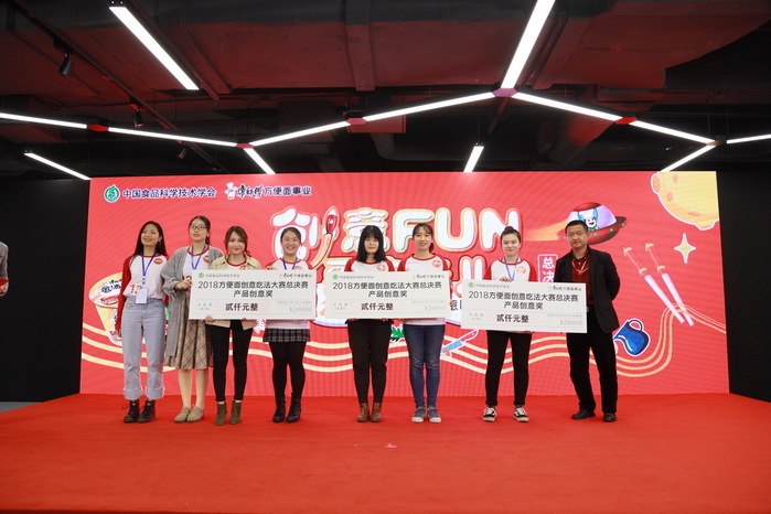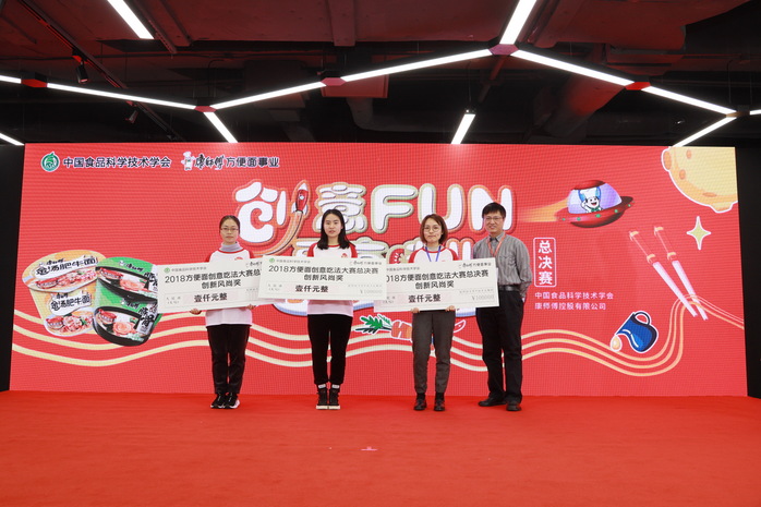 12月8日,由中国食品科学技术学会、康师傅控股有限公司主办的“2018康师傅方便面创意吃法大赛”总决赛在闵行区康师傅大楼举行。2026世界杯官网参赛选手沈瑜、连昱涵、潘小旭、刘昱妏的作品“小仙女VS隔壁老王”荣获产品创意奖,吴安迪、王明达、陈怡君、陆丹琳的作品“干!面”荣获创新风尚奖。康师傅集团上海地区董事长杨乾辉先生、康师傅集团副总裁王世琦先生及中国食品科学技术学会副理事长金征宇、中国食品科学技术学会名誉副理事长潘迎捷教授等出席大赛并给获奖选手颁奖。