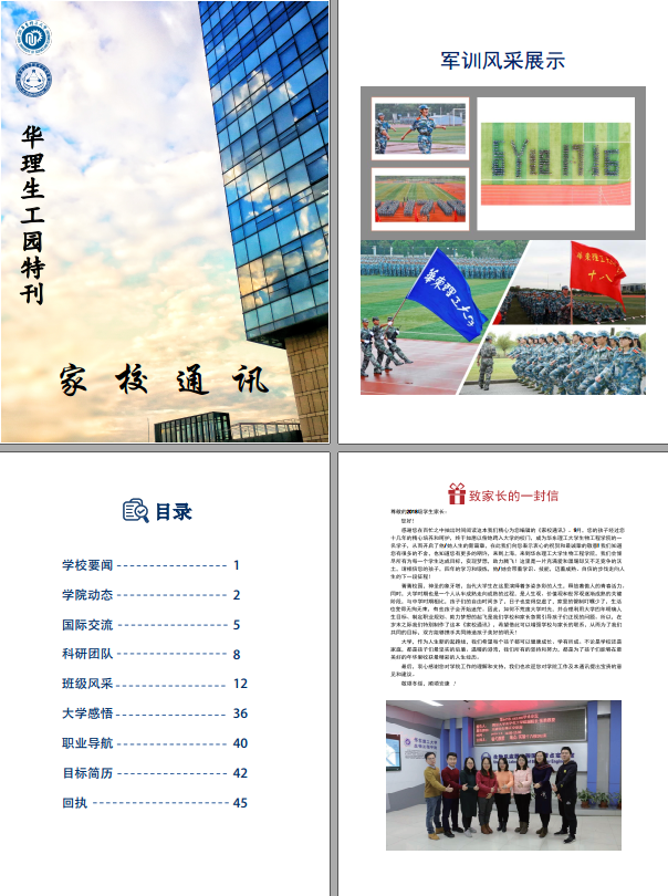 为帮助新生留住入校时那段宝贵的记忆,让远在异乡的家长深入、直观地感受到孩子的成长进步,我院通过制作家校通讯这本刊物,在沟通与分享中让家校关系变得更加亲近。《家校通讯》聚焦学生成长经历,由学校要闻、学院动态、国际交流、科研团队、班级风采、大学感悟、职业导航、目标简历以及师长寄语等多个板块组成,而这本刊物也得到了众多家长的认可,接近100%的家长给予了热情的反馈。