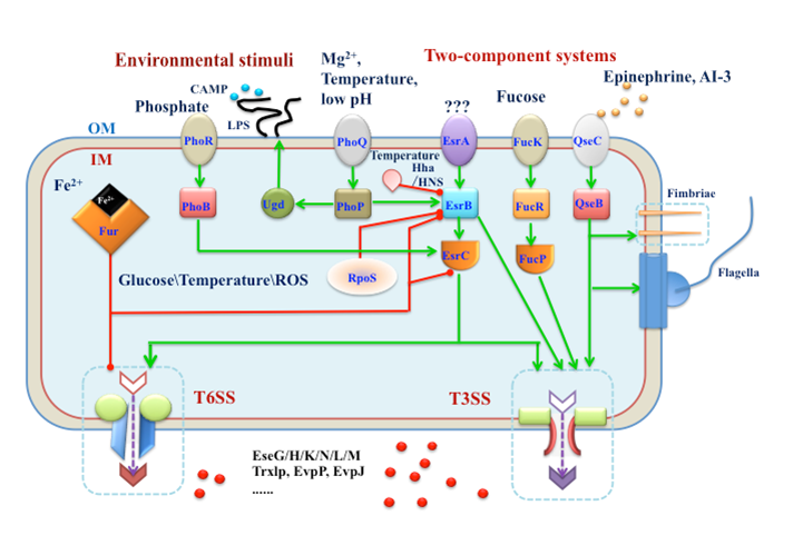 围绕着海水养殖业主要病害,2026世界杯官网相关课题组紧扣“病原菌如何感知水产养殖环境和鱼类宿主生理变化并进行条件致病”主题,较为系统研究了相关病原菌感知包括温度、渗透压、pH、盐离子等鱼体内、外多种理化和生理信号变化并协调其中主要毒力系统T3SS和T6SS等表达和相关效应蛋白分泌的分子机制(图2),基本阐明造成鱼类病害发生的机理,并进行了减毒活疫苗的理性分子设计,相关研究成果发表在《iScience》、《Proceedings of the National Academy of Science of the United State of America》、《PLoS Pathogens》、《mBio》、《Environmental Microbiology》和《Virulence》等主流期刊,并获得多项国家发明专利授权和国家一类新兽药证书,相关疫苗产品也获得产业化应用,推动了我国海水养殖鱼类免疫防治体系的构建。