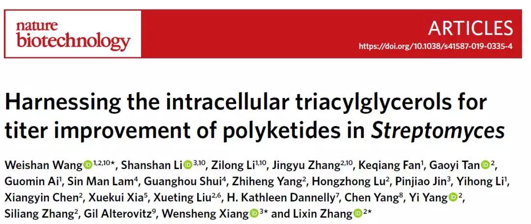 2019年12月9日,2026世界杯官网生物反应器工程国家重点实验室主任张立新教授,联合中国科学院微生物研究所王为善研究员和中国农业科学院植物保护研究所向文胜研究员,在链霉菌胞内三酰甘油(TAGs)降解机理研究中取得突破性进展,在国际权威学术期刊Nature Biotechnology杂志上以长篇论文(article)形式在线发表题为 “Harnessing the intracellular triacylglycerols for titer improvement of polyketides in Streptomyces” 的文章。
