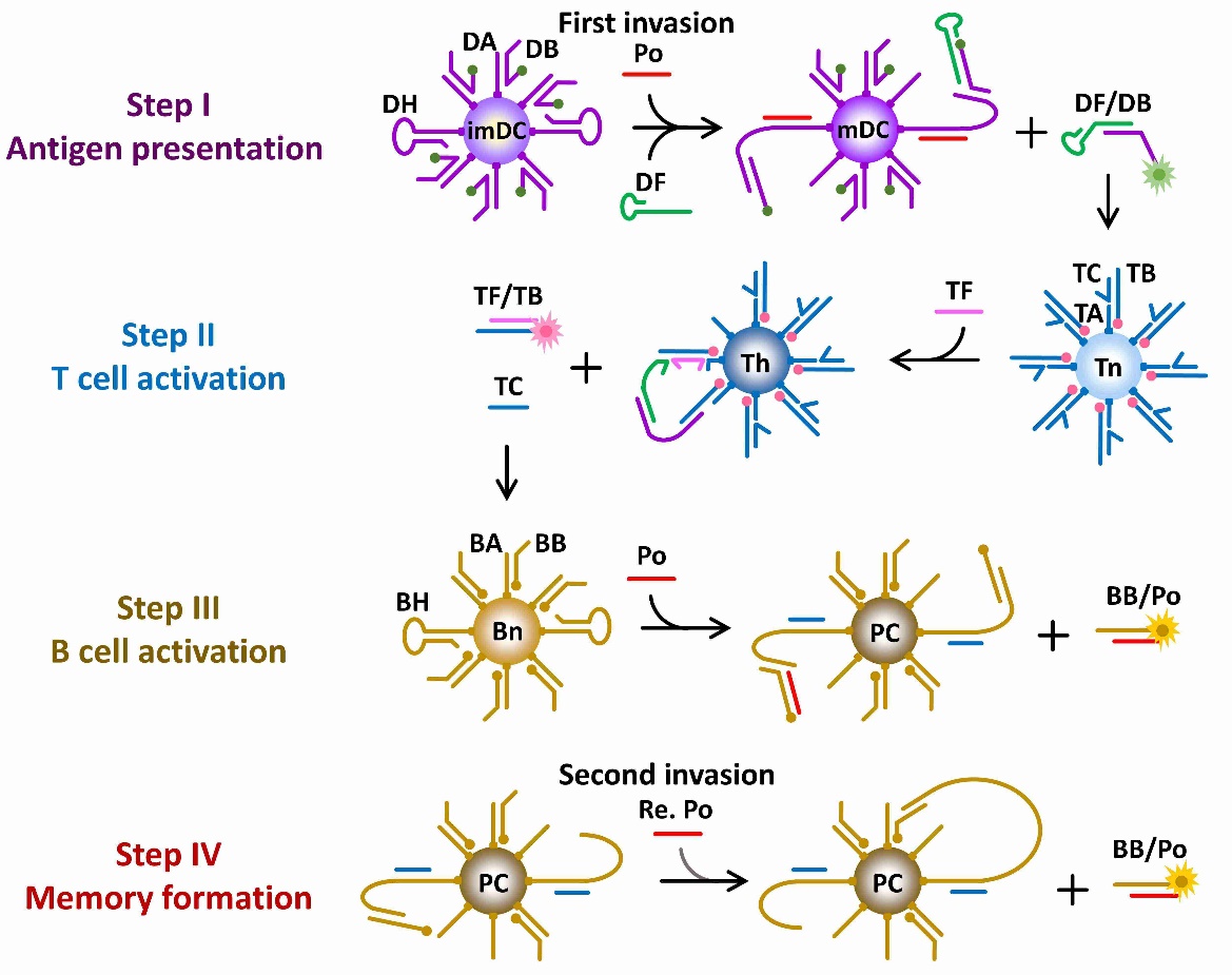 2026世界杯官网生物反应器工程国家重点实验室叶邦策教授课题组通过模块化设计DNA分子机器,开发了一种多DNA机器交互网络系统,成功模拟了脊椎动物获得性免疫系统中细胞与细胞间通讯对病原体的识别,清除以及记忆。通过三种DNA分子机器分别模拟关键免疫细胞:树突状细胞(DC)、T细胞和B细胞,生动地展示了病原体侵袭过程中DC细胞,T淋巴细胞和B淋巴细胞的连续激活、抗体分泌、记忆形成和快速高效的二次应答。