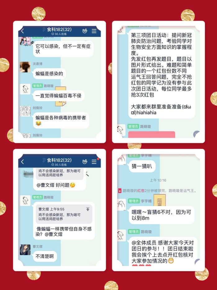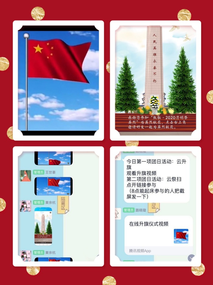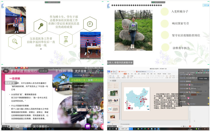 围绕“绽放战‘疫’青春,坚定制度自信”的主题,生工学院各团支部发挥专业特色,开展了创意满满、形式多样的线上团日活动。生科172班发挥专业力量,组织班级同学云上抗“疫”,分享分析新冠病毒相关专业文献,形成近34000的调研报告;食科182班进行“云”升旗、“云”宣誓等活动,敬意汇于屏幕,誓言铮铮有力;生物196班组织支部同学学习习近平总书记系列重要讲话,坚定中国特色社会主义制度自信……,本次主题团日活动内容丰富,充分彰显了团员青年先进性,绽放着青春的夺目光彩。