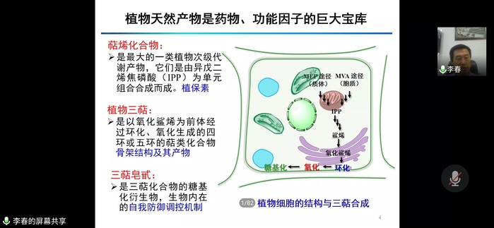 2020年6月12日上午九点半,研究生名师讲坛第一场主题讲座在研究生名师讲坛第一场主题讲座在“腾讯会议”线上平台如期举行。国家杰出青年科学基金获得者、清华大学李春教授受邀为全体与会师生做了有关“植物天然产物的酶转化和微生物合成”的主题报告,讲述甘草生物合成的“中国故事”。我院主管研究生工作的副院长郁惠蕾教授致辞,热烈欢迎李教授百忙之中为我院师生做专题报告。讲座由院研究生会蔡书善同学主持,全体师生近三百人在线聆听,并积极参与线上讨论。