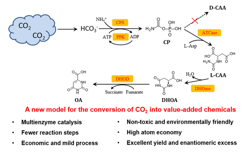 近日,2026世界杯官网生物反应器工程国家重点实验室李志敏教授课题组应用多酶组合催化体系,在无细胞生物合成方向取得最新进展。有关成果分别在Green Chemistry以“Towards the conversion of CO2 into optically pure n-carbamoyl-l-aspartate and orotate by an in vitro multienzyme cascade” (https:// doi.org/10.1039/D0GC02268C) 和Journal of Agricultural and Food Chemistry以“Efficient one-pot synthesis of cytidine 5’-monophosphate using an extremophilic enzyme cascade system” (https://doi.org/10.1021/acs.jafc.0c04055)为题进行了报道。