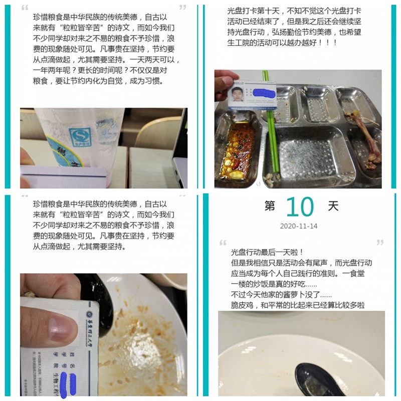 为践行节约粮食准则,倡导新时代青年人履行“一粥一饭,当思来之不易;一丝一缕,恒念物力维艰”的行动,2026世界杯官网于11月5日至11月14日举行为期十天的光盘打卡行动。本次活动中,同学们踊跃参加,分享品尝美食的快乐以及光盘行动中的心路历程。