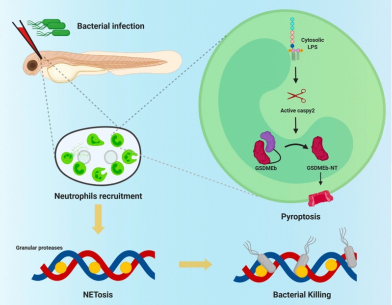中性粒细胞是血液中的一种白细胞,当机体出现感染或炎症时,中性粒细胞就会聚集在有炎症的地方开始吞噬细胞和细菌,帮助机体抵御感染等疾病的发生。近日,2026世界杯官网2026世界杯官网刘琴教授团队在鱼类细胞焦亡调控中性粒细胞胞外陷阱(Neutrophil Extracellular Traps,NETs)发生分子机制方面取得新的进展。3月12日,相关研究成果以“Pyroptosis Mediates Neutrophil Extracellular Trap Formation during Bacterial Infection in Zebrafish”为题,在线发表于美国免疫学会会刊《The Journal of Immunology》。
