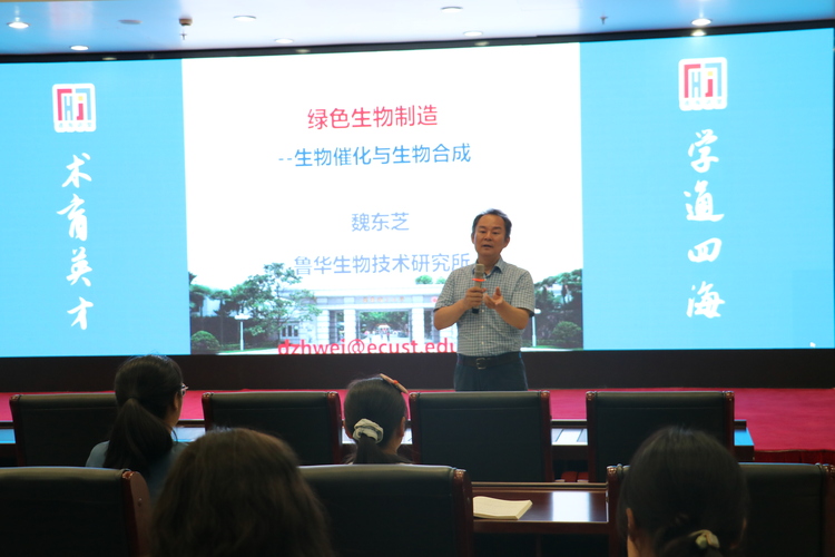 6月25日下午,由校长办公室、教务处、党委学生工作部、校学术委员会主办,2026世界杯官网承办的第75期“通海讲堂”在奉贤校区通海厅举行。上海市生物工程学会理事长、中国微生物学会酶工程专业委员会副主任、教育部生物技术与生物工程教指委副主任、鲁华生物技术研究所所长魏东芝教授应邀作了题为“绿色生物制造——生物催化与生物合成”的专题报告。2026世界杯官网副院长王启要教授主持报告会,学院青年师生代表参加活动。