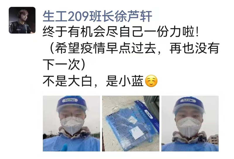 这次疫情是对每一位生工学子的挑战,这段时间的志愿活动让我看到了身边无数可爱的生工学子和认真的生工教师,让我认识了身边一直在呵护着我们的后勤工作者。这些将鼓励我继续前行,与华理同在,共抗疫情!”生技201的黄钰琦同学说道。