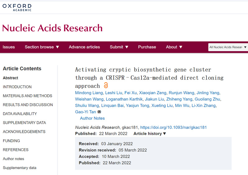 图片说明:学术期刊Nucleic Acid Research在线发表放线菌基因簇捕捉和沉默基因激活新进展