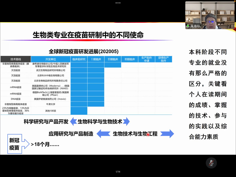 然后,吴老师通过讲解生物类专业在疫苗研制中的不同使命和校友成长史,启发同学们早日规划自己的未来道路,不管是考研或者就业,关键在于个人在读期间的成绩、掌握的技术、参与的实践以及综合素质。
