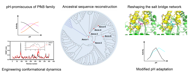 后续利用祖先序列重建,推断并复活了PfkB家族的6个祖先酶。体外催化实验表明祖先酶也具有pH混乱性。在序列比对具有不同遗传关系的PfkB家族成员时,发现了一段未被标注的氨基酸短序列,该序列在不同属来源酶之间差异很大,但在同一属中保守。结合结构和功能分析,猜测该区域很可能包含影响pH的残基。后续实验证实,在该区域理性设计突变即可显著改变酶的pH适应性甚至最适pH值。作者分析这是由于活性中心附近的盐桥网络改变所引起的,据此提出了一种有针对性的内源性微环境工程策略,通过靶向改变盐桥网络来改变酶的pH适应性。该工作首次从进化角度考虑酶的最适pH值的影响因素,为酶促pH适应性工程提供了有趣的新见解。