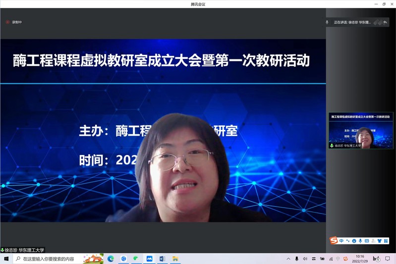酶工程课程虚拟教研室负责人魏东芝教授对教研室的建设初衷、工作基础、建设目标等进行简要说明,并对教研室的后续发展提出了多层面、多角度、多特点的教研思路。魏东芝指出,教研室应当吸纳更多优秀的酶工程课程教师,集结优势资源,开放发展、共建共享,从而研讨形成更优的教学理念、教学方法、授课形式、授课内容。魏教授还表示,所有生命活动都离不开酶,离不开生物催化,应当充分体现酶工程课程的核心地位,通过建成一流的酶工程虚拟教研室网络推动生物专业课程发展。