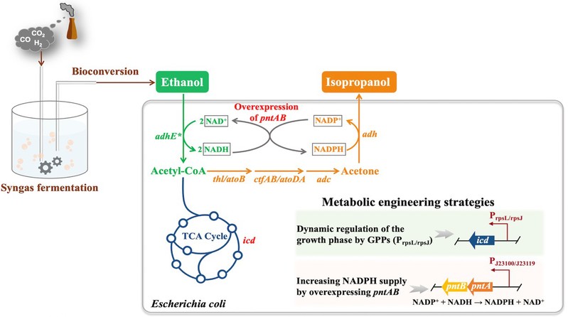 图一 大肠杆菌利用乙醇高效生产异丙醇的可持续生物制造路线