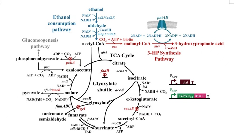 图二 大肠杆菌利用乙醇生产3-羟基丙酸的代谢工程改造示意图