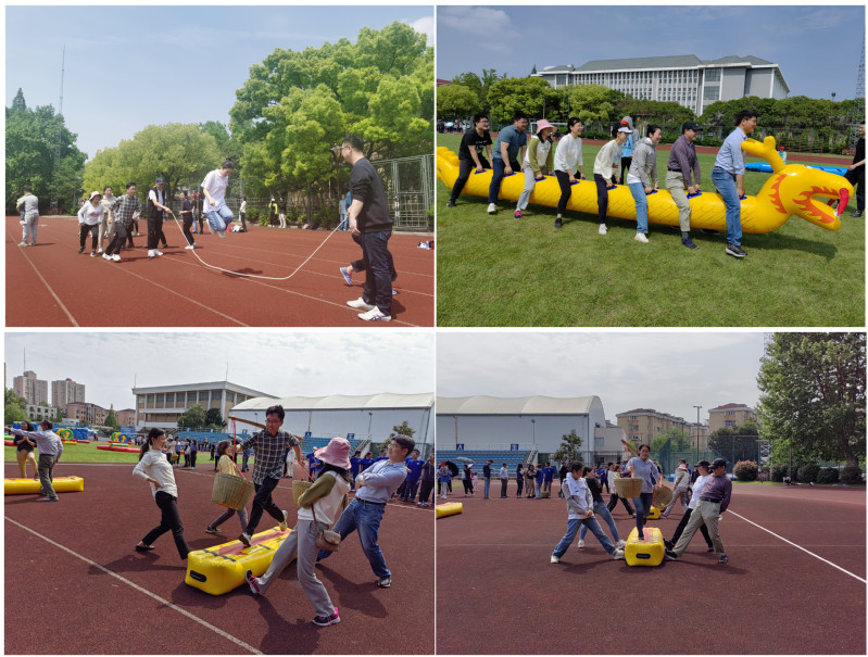 本次趣味运动会工有六个项目:合力跳长绳、投篮机接力赛、旱地龙舟、锁定新目标、铁人四项赛、挑扁担障碍赛。生工学院的教师们积极准备、互相鼓励、全力以赴,赛场上欢声笑语、呐喊助威此起彼伏。