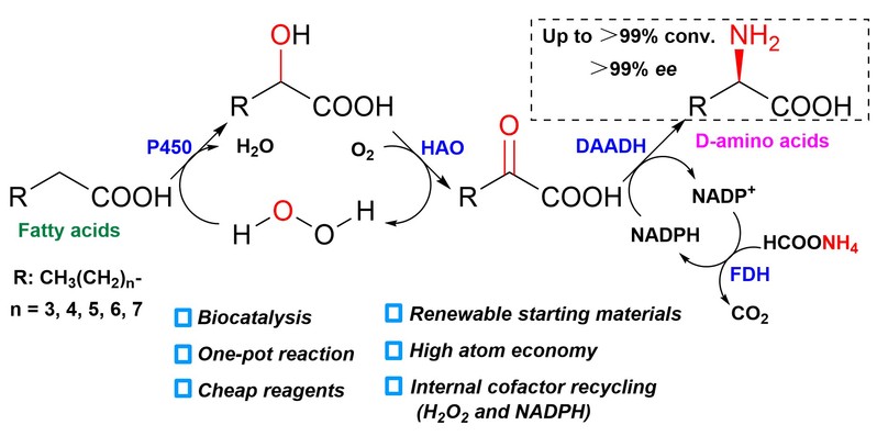近年来,许建和教授团队在以脂肪酸为原料生物级联催化合成ω-羟基脂肪酸、ω-氨基脂肪酸和二元羧酸等功能化学品领域相继取得了一系列突破(J. Agric. Food Chem. 2022, 70(34): 10543-10551; ACS Sustain. Chem. Eng. 2022, 10(39): 13125-13132; ACS Sustain. Chem. Eng. 2021, 9(37): 12514-12519; ACS Sustain. Chem. Eng. 2020, 8: 5558-5565)。但是,由于脂肪酸骨架碳原子的高度相似性和灵活性,对其惰性C-H键进行区域和立体选择性功能化获得高附加值手性化学品仍然是一个巨大的挑战。为此,该研究团队理性设计了一条包括5个酶的三步一锅级联路线,可以实现从廉价易得的脂肪酸高效绿色合成不同碳链长度的D-氨基酸。该级联路线巧妙设计了H2O2和昂贵辅因子NADPH的内部双循环体系,只需催化当量的H2O2和NADPH即可驱动反应进行,操作简单,原子利用率高。这项研究显示出通过设计新的多酶级联体系以环境友好的方式从自然界丰富可再生的资源中获得高附加值手性化学品的巨大潜力。