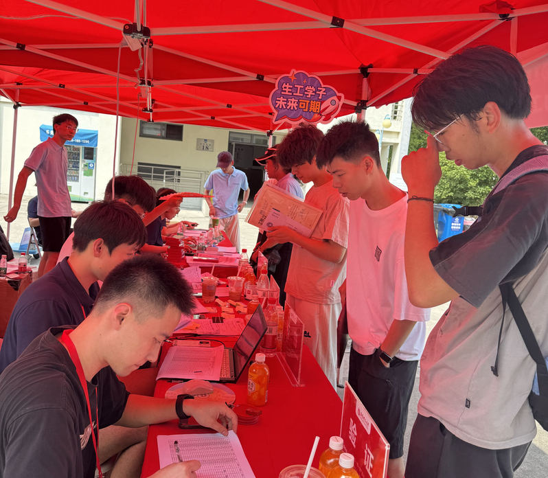 报到点位,志愿者同学各司其职,新生们有序地完成了报到流程,核对新生证件,提交报到材料,领取校园卡、宿舍钥匙、体检单并现场签字确认。炎热天气下志愿者们始终热情周到,彰显生工学子良好风貌。