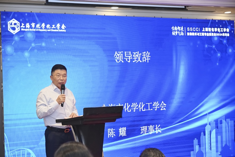 上海市化学化工学会理事长陈耀致辞,他对与会嘉宾表示热烈欢迎,并高度评价了生物技术与工程专业委员会在推动行业技术创新和产学研合作方面所取得的显著成就。陈耀鼓励委员会在新时代背景下,继续发挥桥梁纽带作用,推动我国生物技术与工程领域的高质量发展。