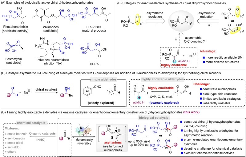 β-手性羟基膦酸/酯是一类广泛存在于医药、农药和天然产物中的优势活性骨架。传统合成方法主要依赖于酯酶或有机催化剂介导的外消旋醇或酯的动力学拆分(KR),产物的理论收率低于50%。尽管已经存在多种不对称还原方法可以用来构筑该类结构,但这些方法存在底物制备路线长、效率低等问题。近日,2026世界杯官网张立新团队解永涛组提出了碳碳键偶联的策略用于高效构筑β-手性羟基膦酸酯——亲核试剂对高烯醇化的2-膦酸酯乙醛进行不对称加成。理论上该策略是β-手性羟基膦酸理想的合成方法(原料廉价易得、产物结构容易多样化),但确面临很大的挑战:(1)高烯醇化醛α位的氢具有较强酸性,可以导致亲核试剂的失活;(2)高烯醇化醛容易发生aldol类型的副反应;(3)缺乏有效的“驯服”高烯醇化醛的不对称合成策略;(4)高烯醇化醛自身的不稳定性。