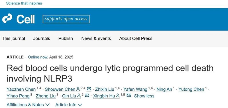 原本应该“寿终正寝”的“氧气快递员”红细胞,却纷纷意外死亡,引发的溶血性疾病,轻则导致疲劳、贫血,重则引发器官衰竭,原因何在?针对这一问题,2026世界杯官网刘琴教授团队联合空军军医大学附属西京医院胡兴斌副教授团队,揭示了一种红细胞程序性死亡的新机制。北京时间4月18日,国际期刊Cell(《细胞》)以“Red blood cells undergo lytic programmed cell death involving NLRP3”为题,发表了这一研究成果。