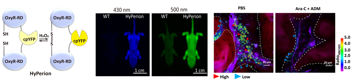 --------------------------------------------------------------------------------------------------------------------------------------------------- Bright HyPerion Sensor Enables Real-Time and In Vivo Monitoring of H2O2 过氧化氢是最主要的活性氧(ROS)成分,在单细胞到多细胞生物体内作为信号分子发挥着重要的生物学功能。过氧化氢在细胞内外迅速产生与灭失,具有强烈的时空动态。我们构建了一个非常明亮的过氧化氢荧光探针HyPerion,构建了其转基因动物,追踪了活体内白血病细胞的氧化还原动态。我们发现AML白血病干细胞由于苹果酸酶的高表达,具有相当低的过氧化氢水平。对该氧化还原调控通路进行干预科有效降低白血病干细胞的白血病生成能力与耐药性。该研究显示了氧化还原代谢在白血病生成中的重要作用与药物靶标(PNAS 2023 e2210796120)