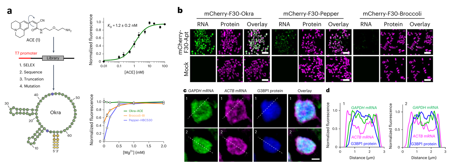 --------------------------------------------------------------------------------------------------------------------------------------------------- Imaging the dynamics of messenger RNA with a bright and stable green fluorescent RNA 在众多光谱的荧光RNA中,绿色荧光RNA凭借其广泛的通用性以及可以适配几乎所有的荧光检测设备而受到广泛关注【5】。然而现有的绿色荧光RNA存在细胞亮度低、光稳定性差、背景荧光高等不足,限制了它们在活细胞中的应用。创新发展了活细胞内具有超高亮度和光稳定性的新型绿色荧光RNA Okra,Okra不仅可用于细菌和哺乳动物细胞内mRNA的高亮度、低背景、长时间连续成像与示踪,还首次实现了活细胞RNA的绿色单色和双色超分辨成像。利用Okra, 我们进行了应激颗粒内不同mRNA分布的超分辨成像,揭示了不同mRNA在颗粒中分布的异质性和不均一性。我们此次报道的Okra荧光RNA是目前最亮、最稳定的绿色荧光RNA,填补了活细胞单色或多色RNA成像中明亮稳定绿色荧光RNA的空缺。Okra将为RNA复杂生物学功能与调控机制研究提供极具价值的实用工具 (NatureChemical Biology 2024,20, 1272). Highlighted by Nature Chemical Biology and Nature Review Chemistry (Nature chemical biology 2024, 20, 1246; Nat Rev Chem 2024, 8, 651)