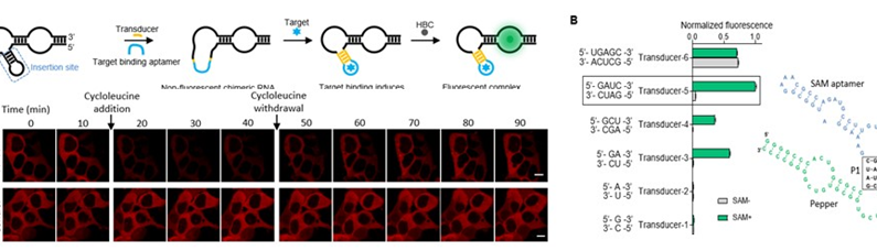 --------------------------------------------------------------------------------------------------------------------------------------------------- Imaging intracellular metabolite and protein changes in live mammalian cells with bright fluorescent RNA-based genetically encoded sensors 目前,基于荧光蛋白的高性能细胞代谢探针的种类与颜色仍然有限。我们基于此前发展的高性能荧光RNA(Pepper)发展了一系列可特异性识别不同小分子代谢物,如SAM的遗传编码荧光探针。研究团队利用Pepper-SAM探针实现药物刺激下活细胞中SAM水平动态变化的实时标记与成像。相比前人制备的SAM探针相比,活细胞内Pepper-SAM的荧光强度增加了10倍以上,达到了实用水平。此外,这种基于荧光RNA的代谢探针还可以随意更换颜色。理论上,针对任何代谢物小分子或者蛋白等大分子,基于荧光 RNA 技术都可能发展出相应的传感器。这有助于突破现有传感器种类缺乏多样性的限制,大大扩展传感器的应用领域。(Biosens Bioelectron 2023, 235, 115411)