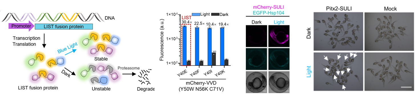 Controlling protein stability with SULI, a highly sensitive tag for stabilization upon light induction 基因编辑、转录调控和RNA干扰是广泛使用的操纵蛋白质水平的方法,但这些方法在表型控制方面存在有很大的延迟。内源性细胞蛋白可以在蛋白酶体靶向的情况下,通过蛋白酶体靶向的嵌合分子(PROTACs)或通过降解特定的抗体和抗体受体来进行目的蛋白的快速降解,然而这些诱导剂是自由扩散的,也很难从生物系统中去除,因此难以实现蛋白的时空表达。发展了光诱导稳定的蛋白质降解标签SULI(stabilization upon light induction),在黑暗条件下,SULI标签会被细胞的降解系统识别并降解;在蓝光照射下,SULI标签则非常稳定。SULI可插入在目的蛋白的N端、C端甚至是内部,利用光强与光照时间来调控这些不同蛋白的稳定性。利用SULI,我们实现了酵母有丝分裂与斑马鱼发育过程的精确控制。SULI为研究不同细胞过程中的蛋白质代谢和功能提供了一个强大而方便的工具。(Nature Communications 2023, 14, 2172)