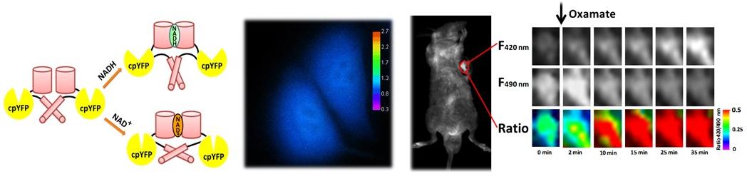 Frex 系列遗传编码荧光探针实现了在活细胞各亚细胞结构中对细胞代谢的动态检测与成像,是研究癌症及代谢类疾病及药物筛选的有力工具。 图片显示了对线粒体抑制剂对细胞内线粒体中NADH代谢的影响。(Cell Metabolism, 2011, 14, 555) -------------------------------------------------------------------------------------------------------------------------------------------------------- In vivo Imaging of Cell Metabolism Using SoNar