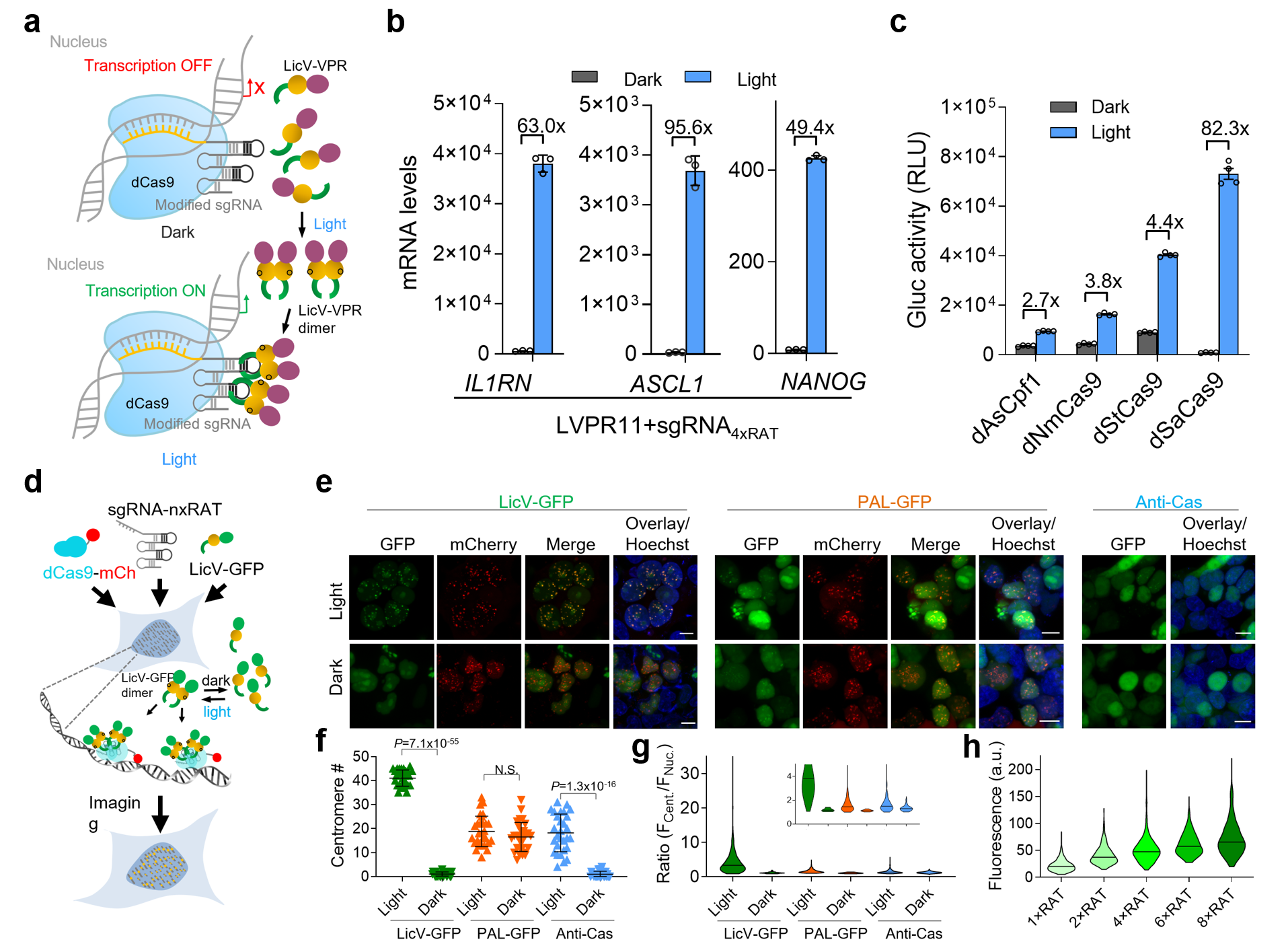 --------------------------------------------------------------------------------------------------------------------------------------------------- Optogenetic control of RNA function and metabolism using engineered light-switchable RNA-binding proteins RNA像蛋白质一样具有复杂的高级结构与相互作用,复杂而精确地执行丰富多彩的生物学功能。与蛋白质研究相比,人们对细胞内RNA时间空间分布及其功能的研究目前仍然有一定滞后,其中一个重要的原因是目前仍缺乏可以在活细胞内对RNA分子进行高时空分辨精密控制的技术。针对这一亟需解决的技术挑战,我们基于合成生物学及光遗传学原理并结合全新的高通量筛选策略成功构建了LicV系列光控RNA效应因子,实现了动物细胞内RNA生成、剪接、运输、翻译、降解等代谢活动的时空精密控制。LicV与CRISPR-Cas系统结合而成的LA-CRISPR系统,可具有更高的激活效率与更低的非特异性。LicV系列光控RNA效应因子与我们前期发展的Pepper技术结合,可在活细胞上对RNA进行时间和空间尺度的闭环监测与控制,为深入探究单细胞内RNA的功能和复杂调控机制提供极具价值的创新研究工具。(Nature Biotechnology 2022, 40, 779-786;Nature Protocols 2023, online)